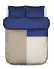 Bold Modernity. Feiner Bio-Baumwollsatin, GOTS-zertifiziert. Eine reine Bio-Baumwolle, die sich ideal für Bettwäsche eignet, da sie weich, geschmeidig und gleichzeitig atmungsaktiv ist. Mit großflächigem Colourblocking auf der einen Seite mit kühlem Kobalt kombiniert mit neutralen Sandtönen. Die Rückseite ist einfarbig kobaltfarben.